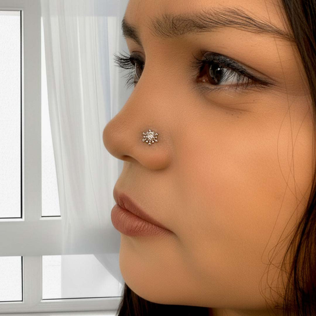 Delicate yet dazzling, our Dandelion Silver Nose Pin brings a subtle sparkle to your everyday style. Handcrafted in 92.5 sterling silver and set with a brilliant 5A CZ stone, it’s designed to catch the light and eyes with effortless grace. A timeless piece that adds just the right touch of shimmer to any look.